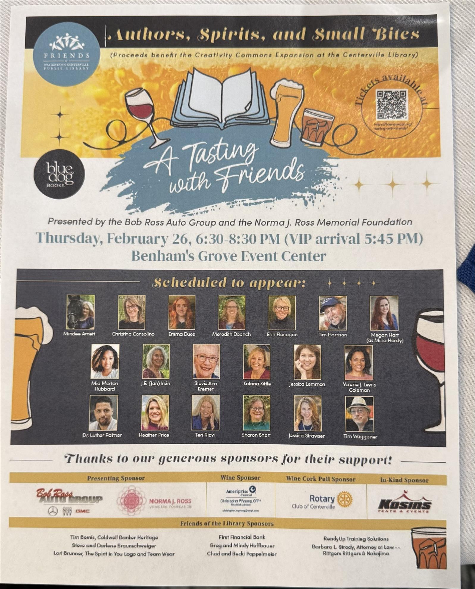 - February 26, the Friends of the Library is having an event, A Tasting with Friends with food, wine, and visiting with local authors. The proceeds will go toward the new Creativity Commons area of Centerville Library.