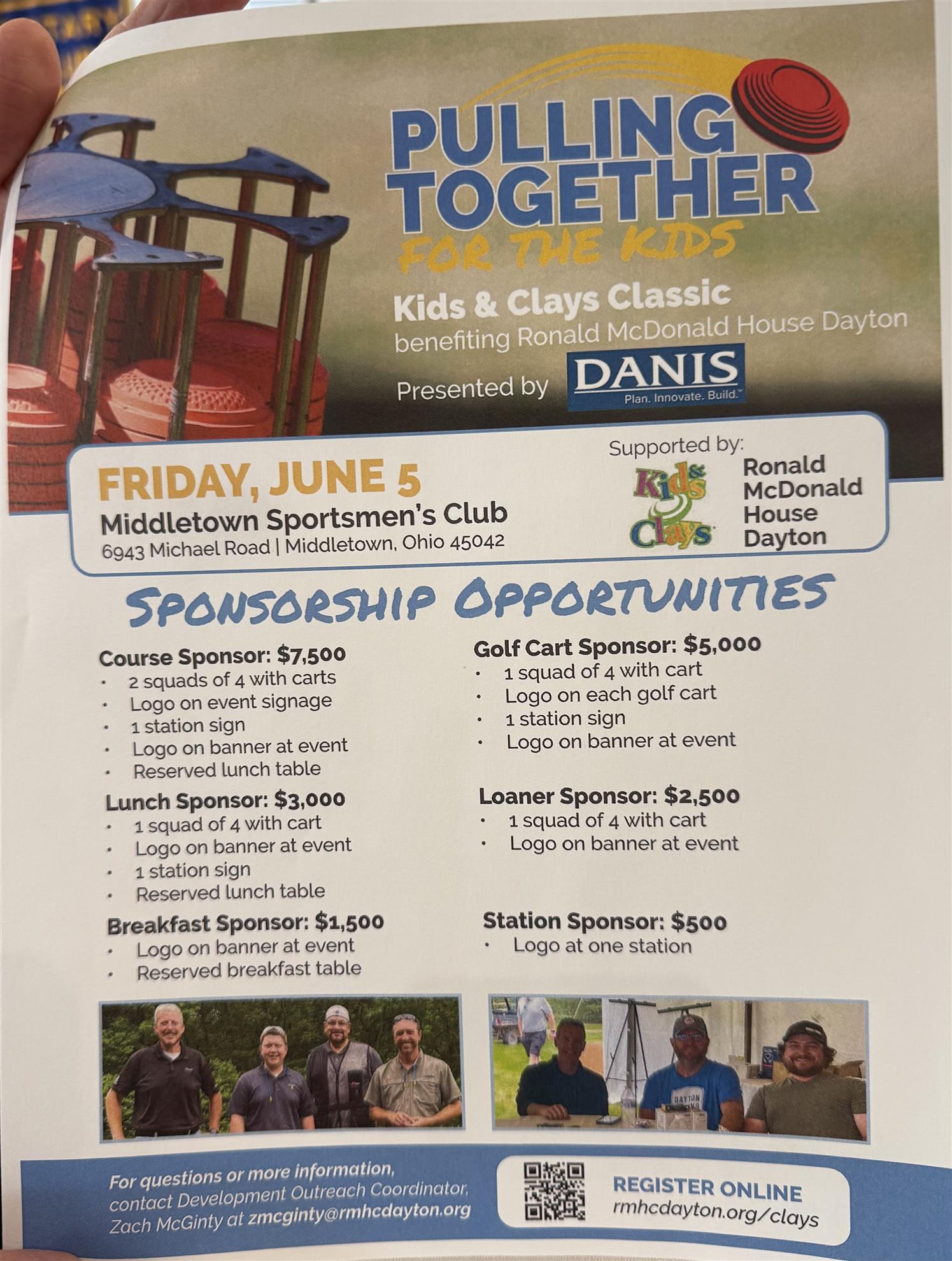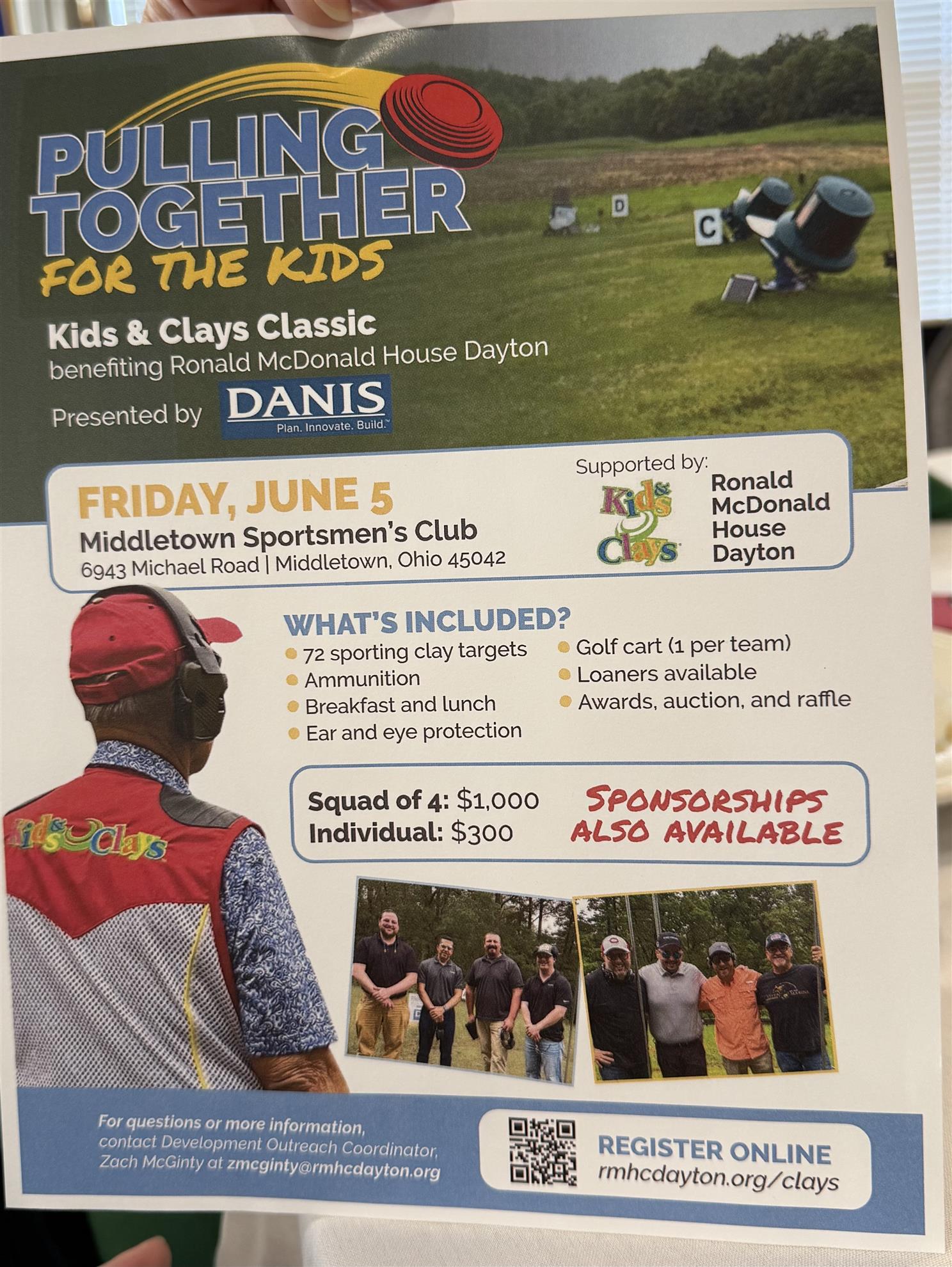 Sue shared information about a fundraiser for Ronald McDonald House called Kids and Clays. It is a sporting clays event, with clay pigeons on June 5 at the Middletown Sportsmen’s Club. Sponsorship or play opportunities are available. It is like a golf tournament; you are given golf carts and you go to various spots along the course to shoot at the clays. The event includes breakfast and lunch, awards, raffle, and auction.