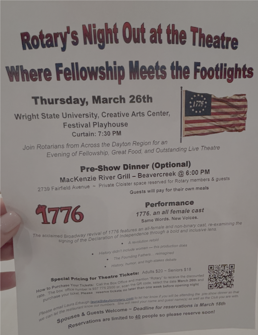 - Thursday, March 26 is Rotary Night at WSU Creative Arts Center, Festival Playhouse to watch the performance of 1776