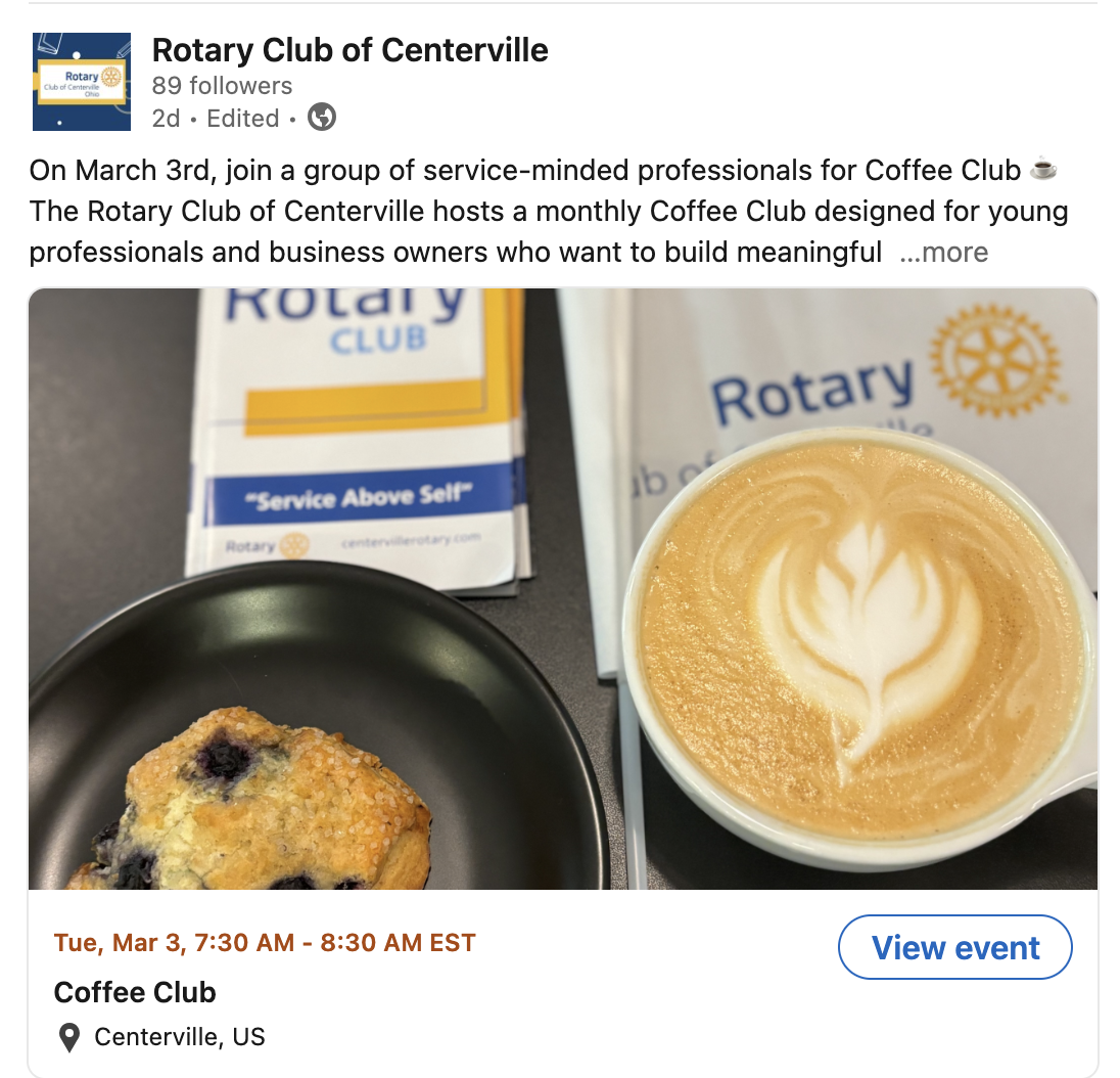 President Adam Manning welcomed everyone to the Centerville Rotary Club and led reciting the Pledge of Allegiance. Brian Hayes provided the prayer.