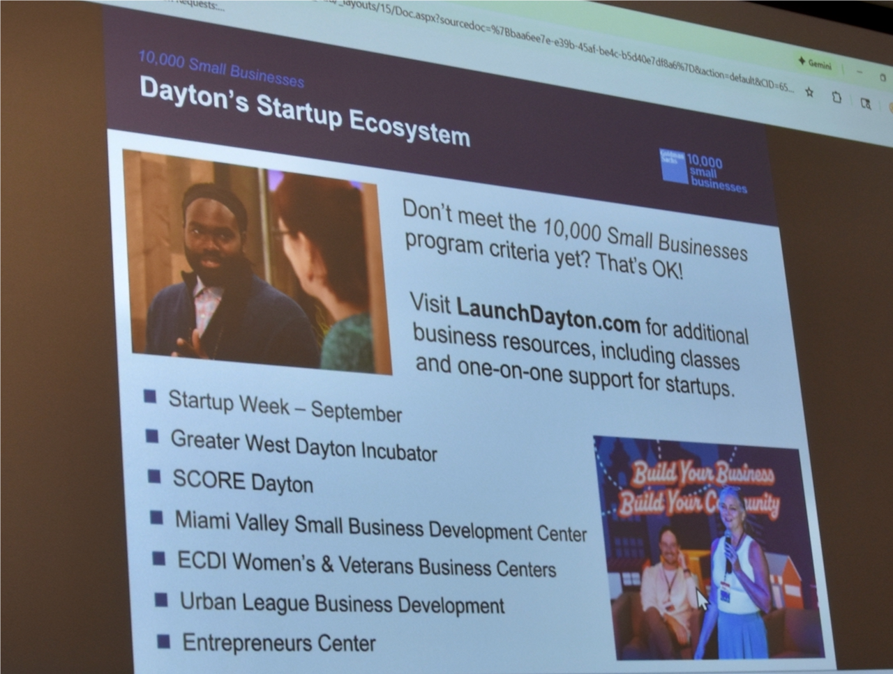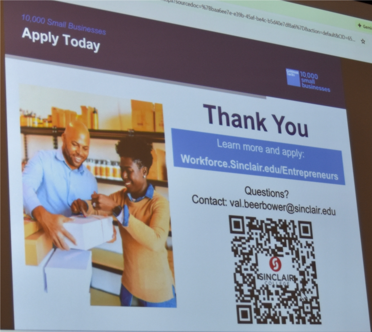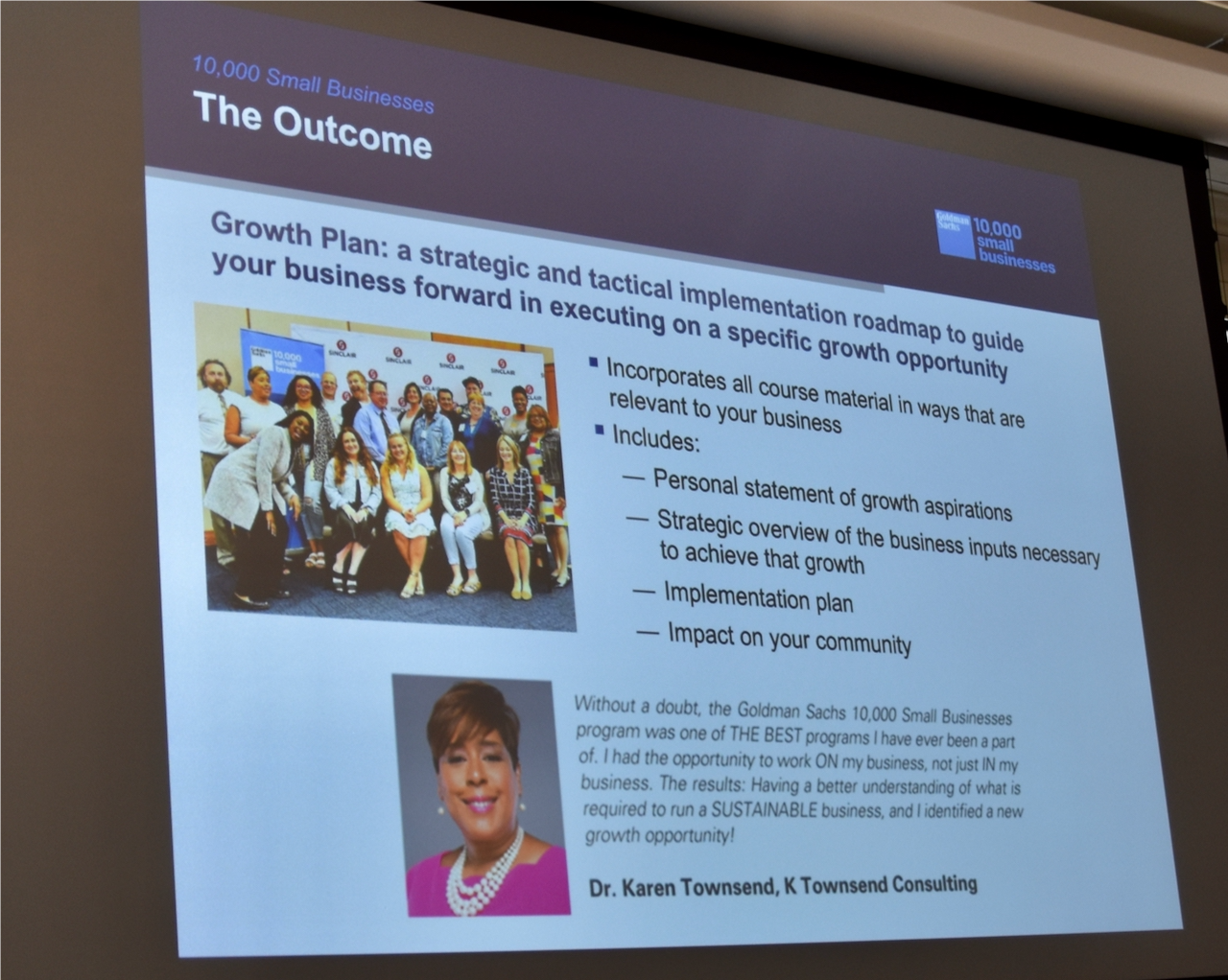 Our speaker today was Val Beerbower, with Sinclair Community College to share information about the Goldman Sachs Foundation 10,000 Small Businesses program.