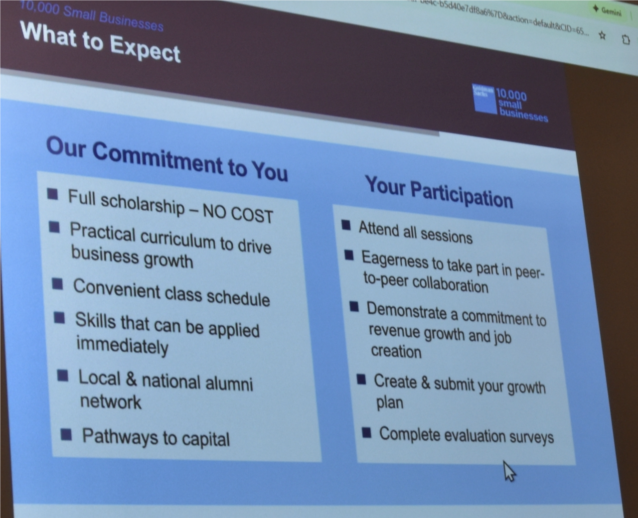 The program focuses on revenue growth and job creation. You spend 100+ hours in the 2-year program, some in class, some work outside of class. Val said it is like getting a “Baby MBA,” completing a case study for your business. Learn more about your business, how to read financial statements, make financial projections, and more.
