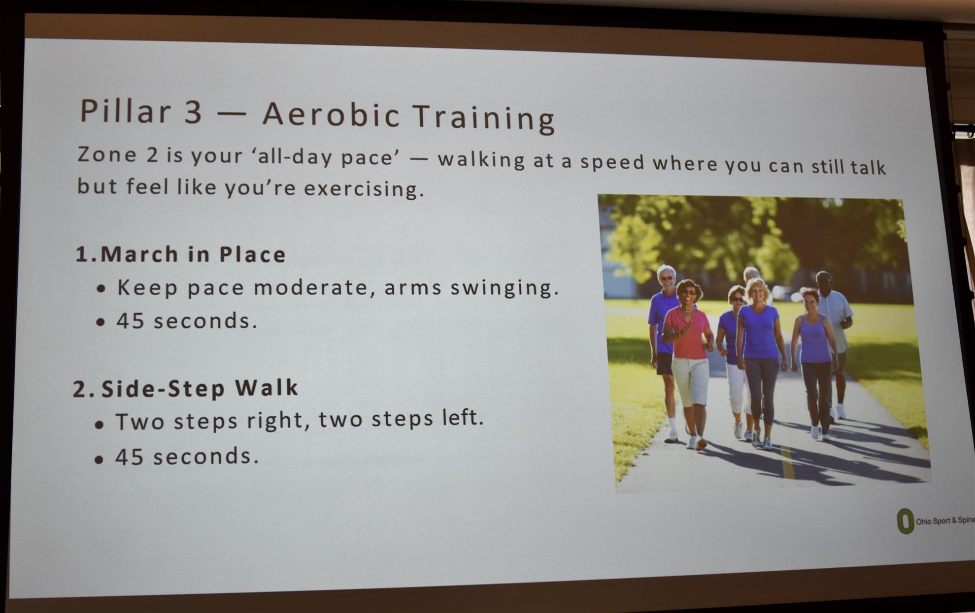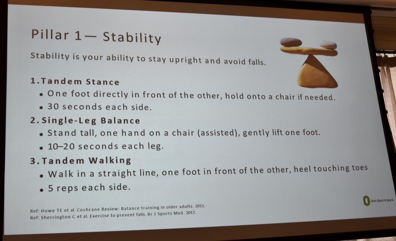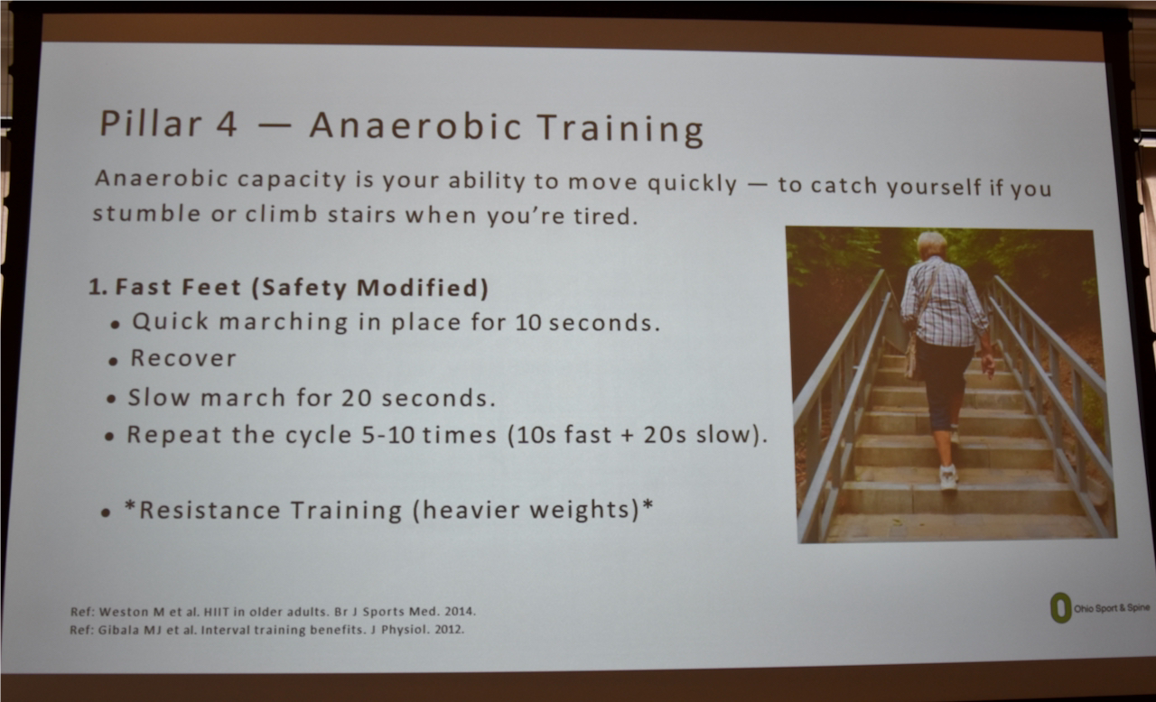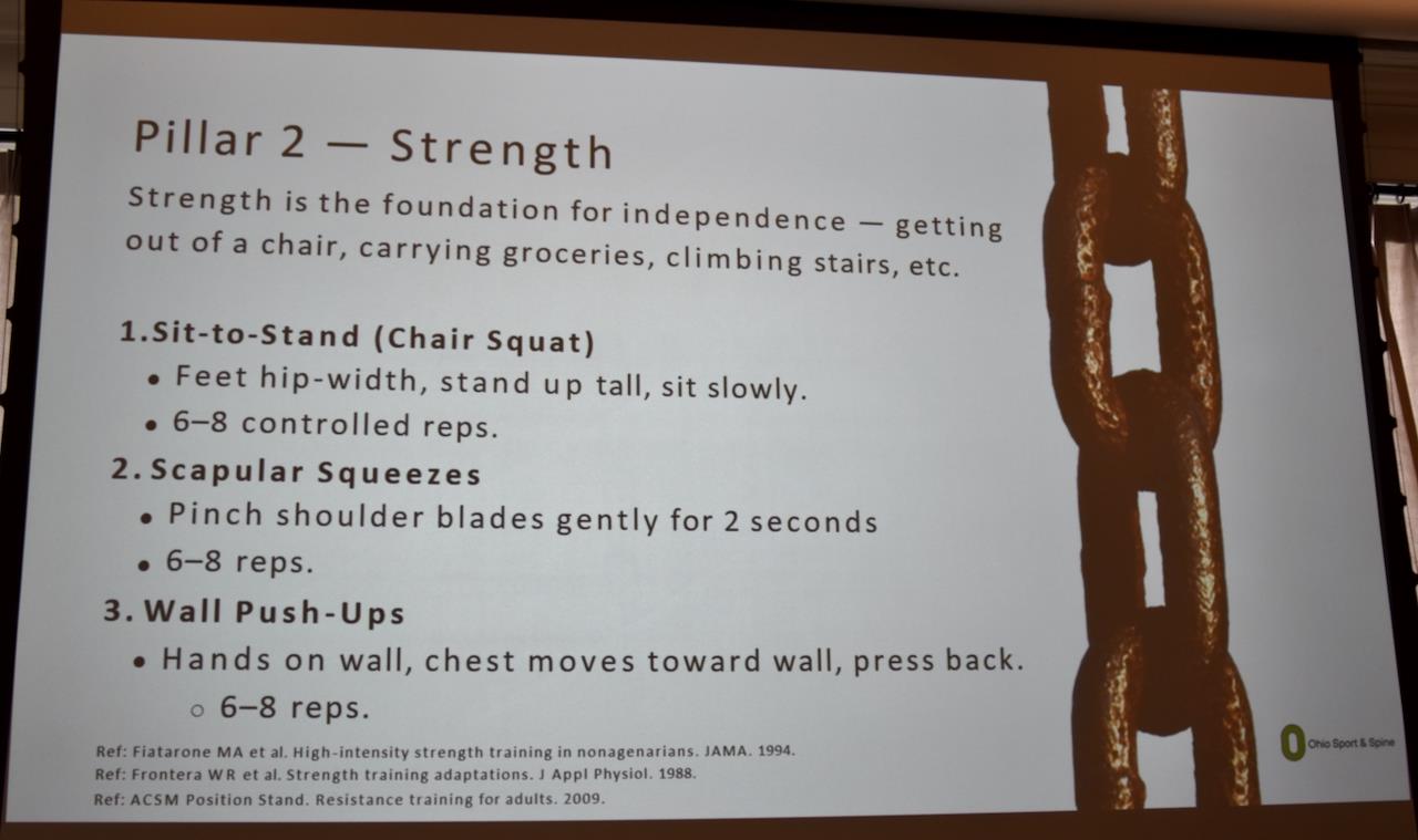 Healthspan = quality of life that increases your lifespan. Everyone wants to be able to age well and live independently. He then led the group through some exercises for each pillar.