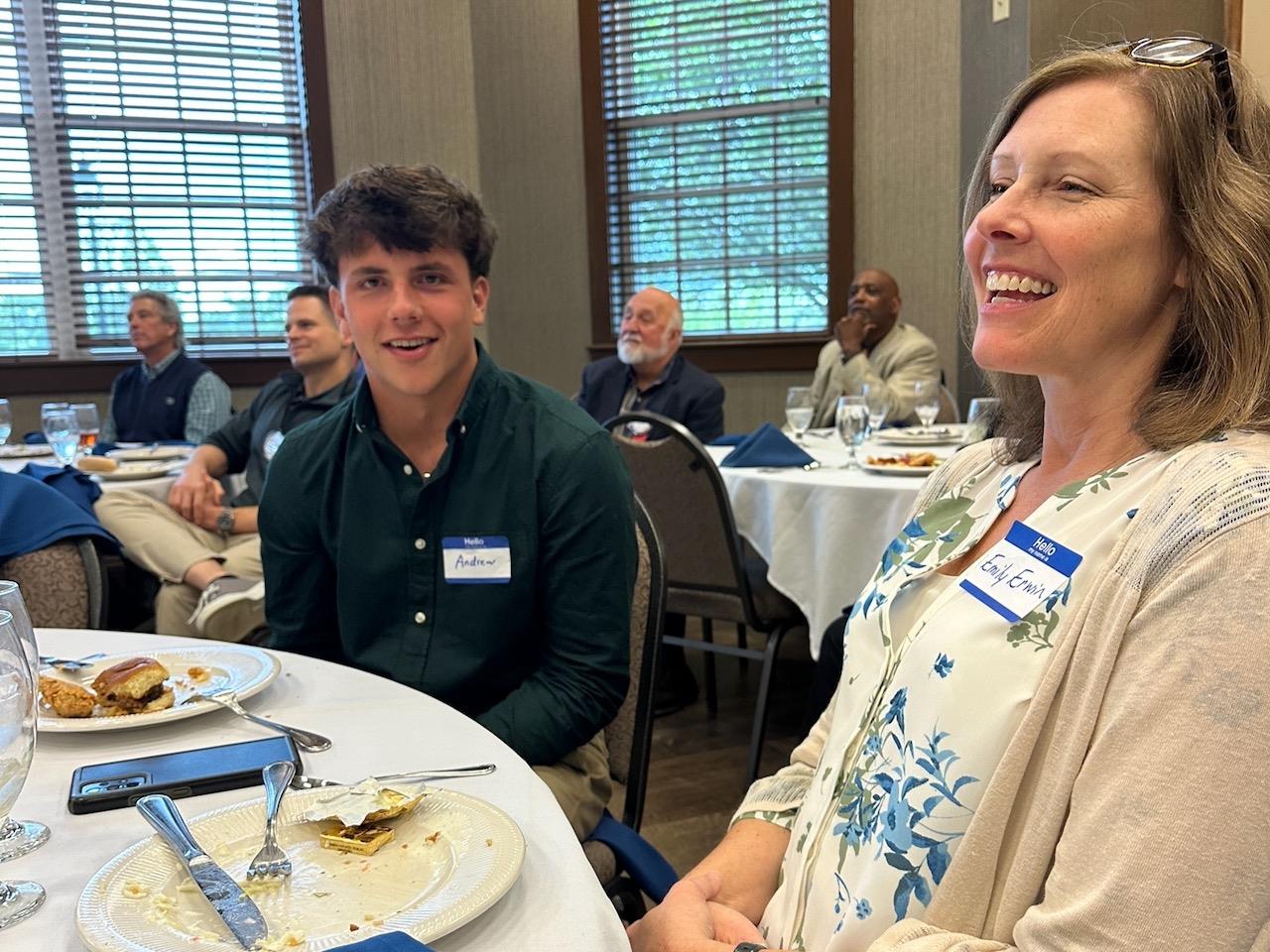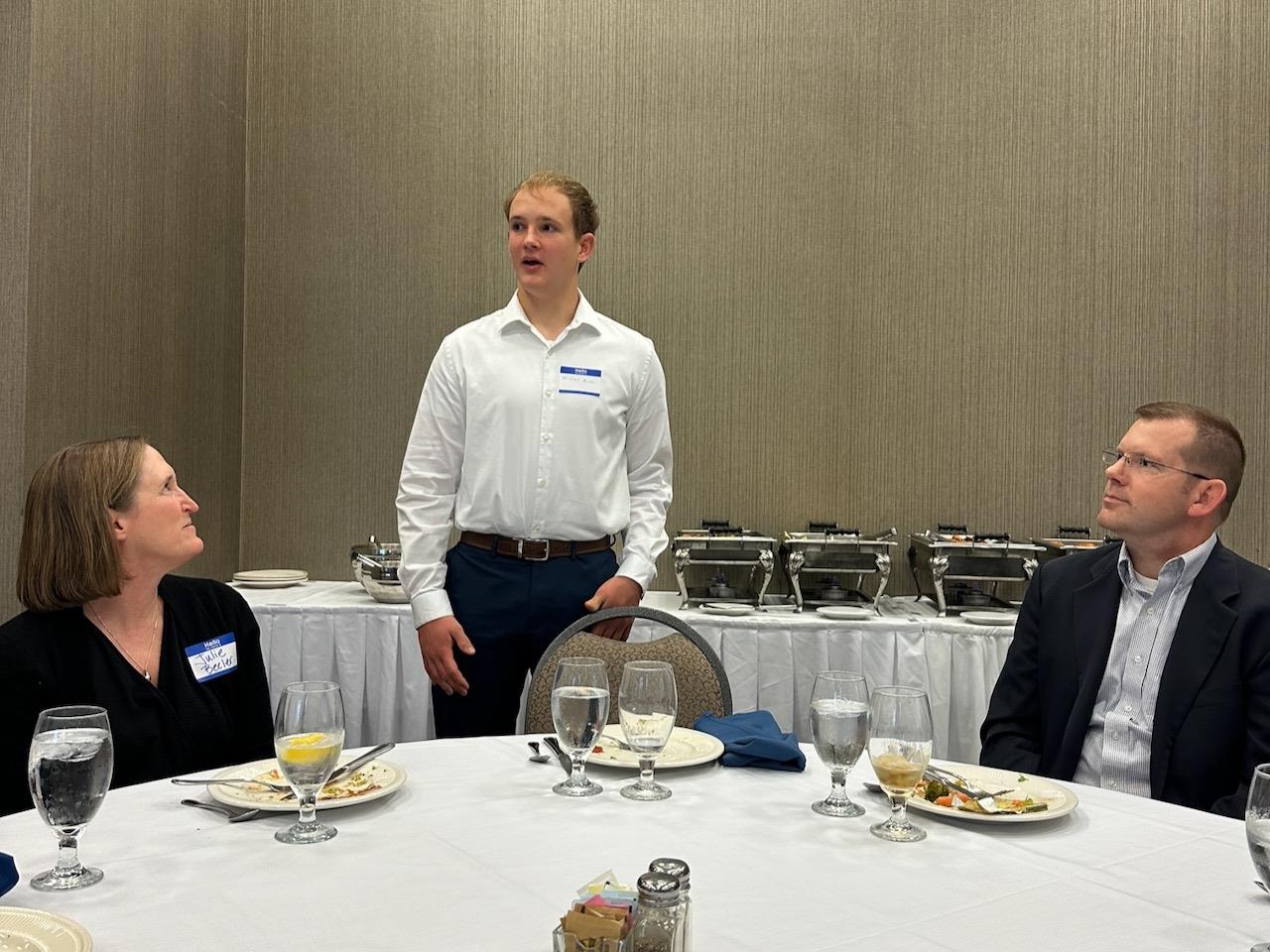 Andrew Erwin, introduced his mom Emily, and said he will attend Massachusetts Institute of Technology (MIT) and study mechanical engineering. He wants to eventually start a business. Bill Menker presented Andrew with a book that applies to his area of interest. His book was Machinery’s Handbook Pocket Companion.