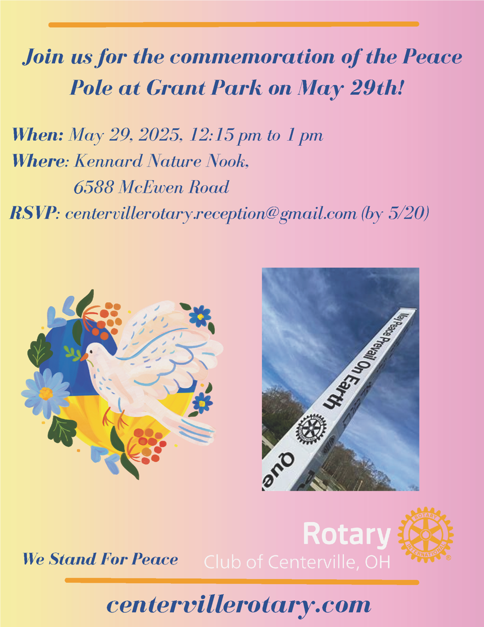 - May 29 Peace Pole Installation meeting will be at the Kennard Nature Nook entrance to Grant Park, 12:00 noon. DLM boxed lunches will be ordered. Let Kelly know what you want if you haven’t already.