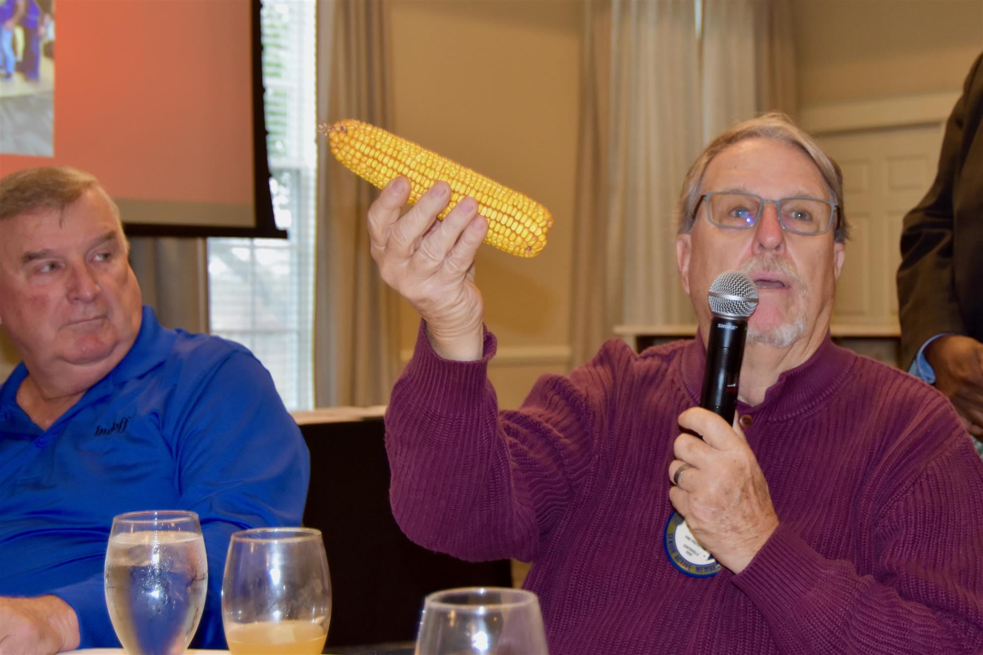 - Lee H for Frank S, a Past District Governor. He reminded us of the Pancake kitchen motto: “We serve no cake before it’s time.” Everyone on grills did a great job and the money raised was incredible. The farm report was farmers are getting 210 bushels of corn to the acre with 15.5% moisture, which is good.