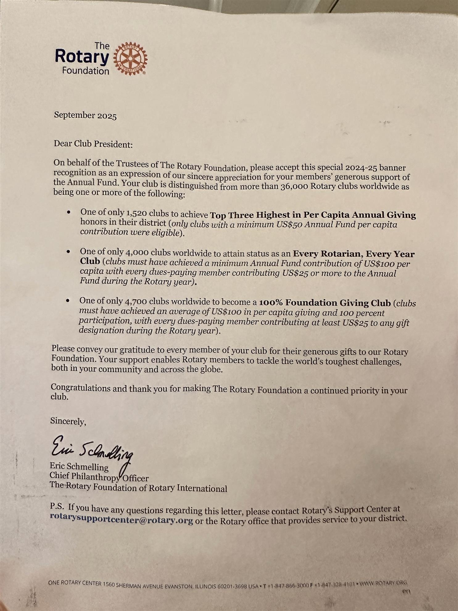 Several years ago, Rotary International set a goal for the Foundation to reach $2,025,000 in 2025. As of June 30, 2025, there is $2,050,000 in the endowment fund.