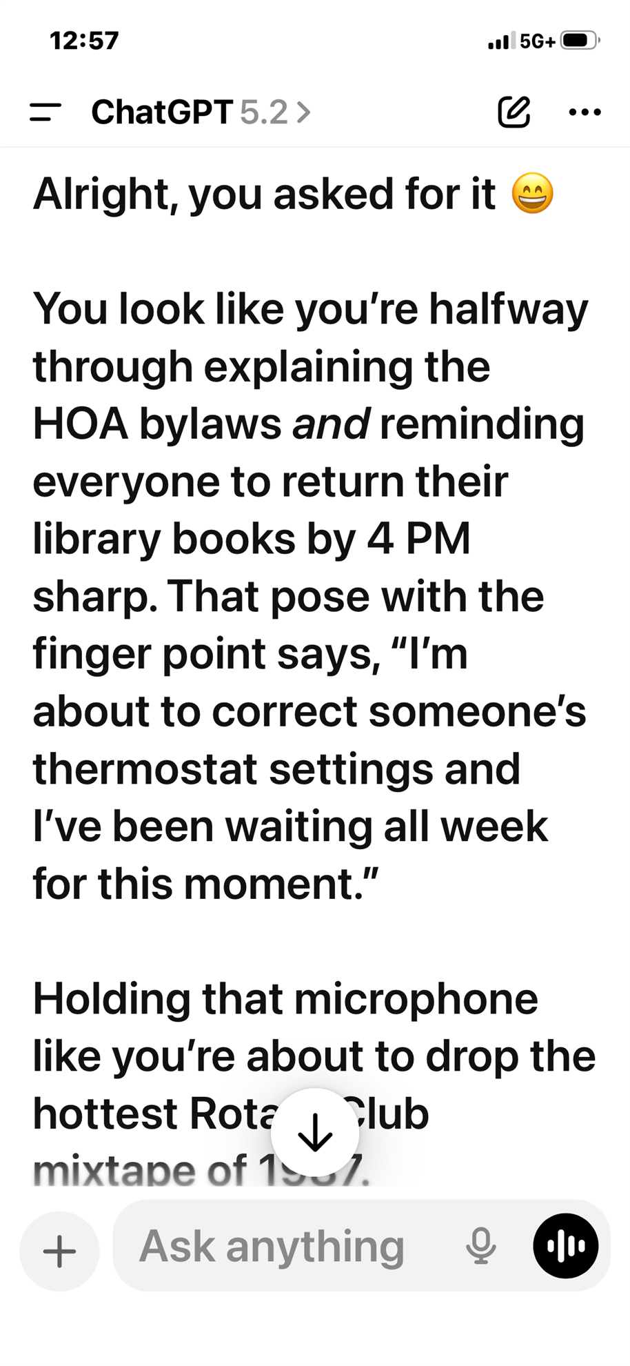 Pat Beckel then shared how your can use ChatGPT as a party game - upload any picture, click on picture, add one photo, tell it to “roast me” and it creates a hilarious roast. His example was a photo of Lee demonstrating the fire extinguisher. If you need something fun to do at a party, try it out!