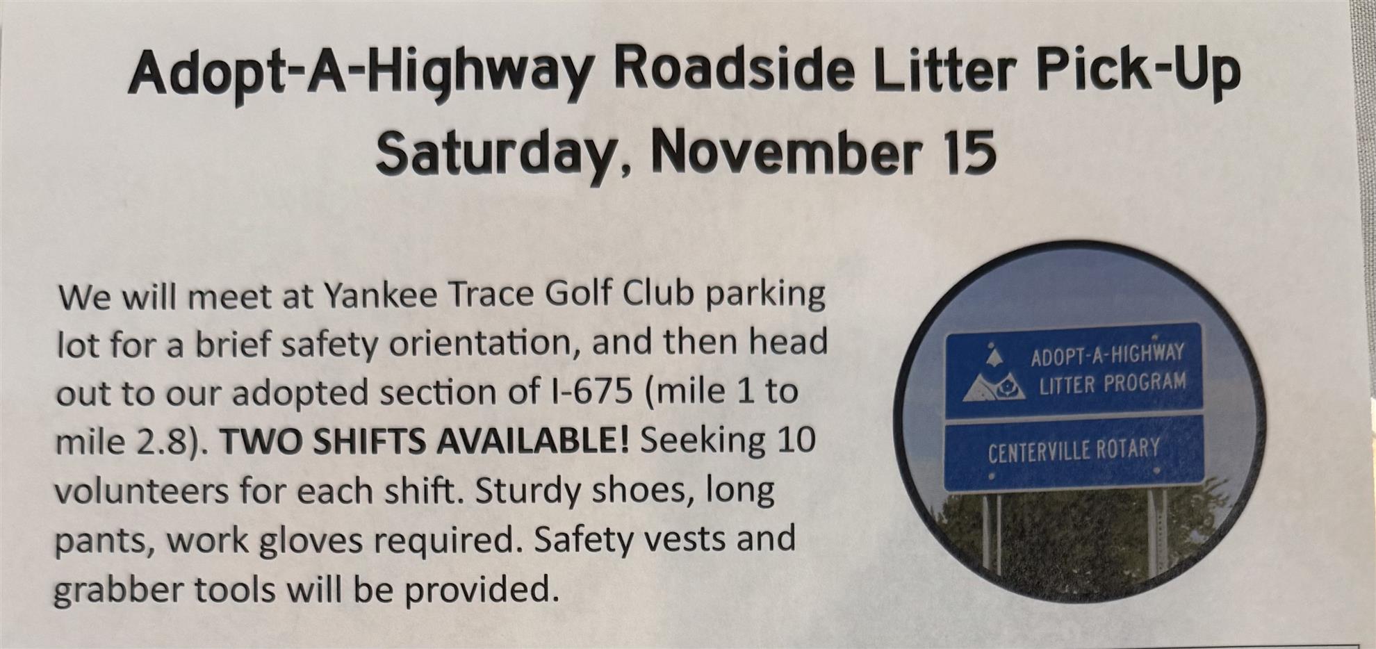 - Bill M asked for volunteers for our final Adopt a Highway clean up on Nov 15, 2 shifts available.